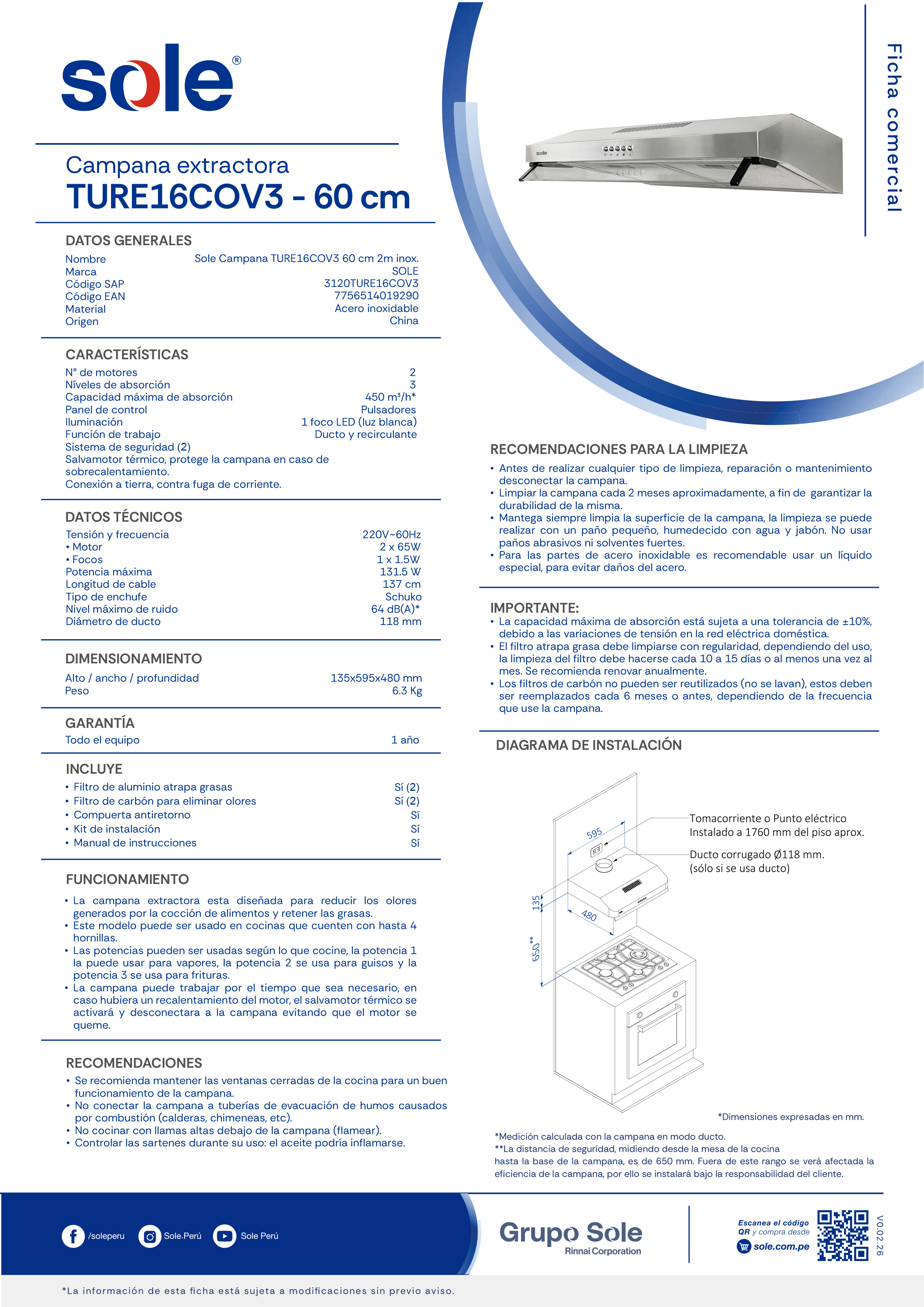 | Dimensiones (alto x ancho x profundidad) | 135 x 595 x 480 mm |