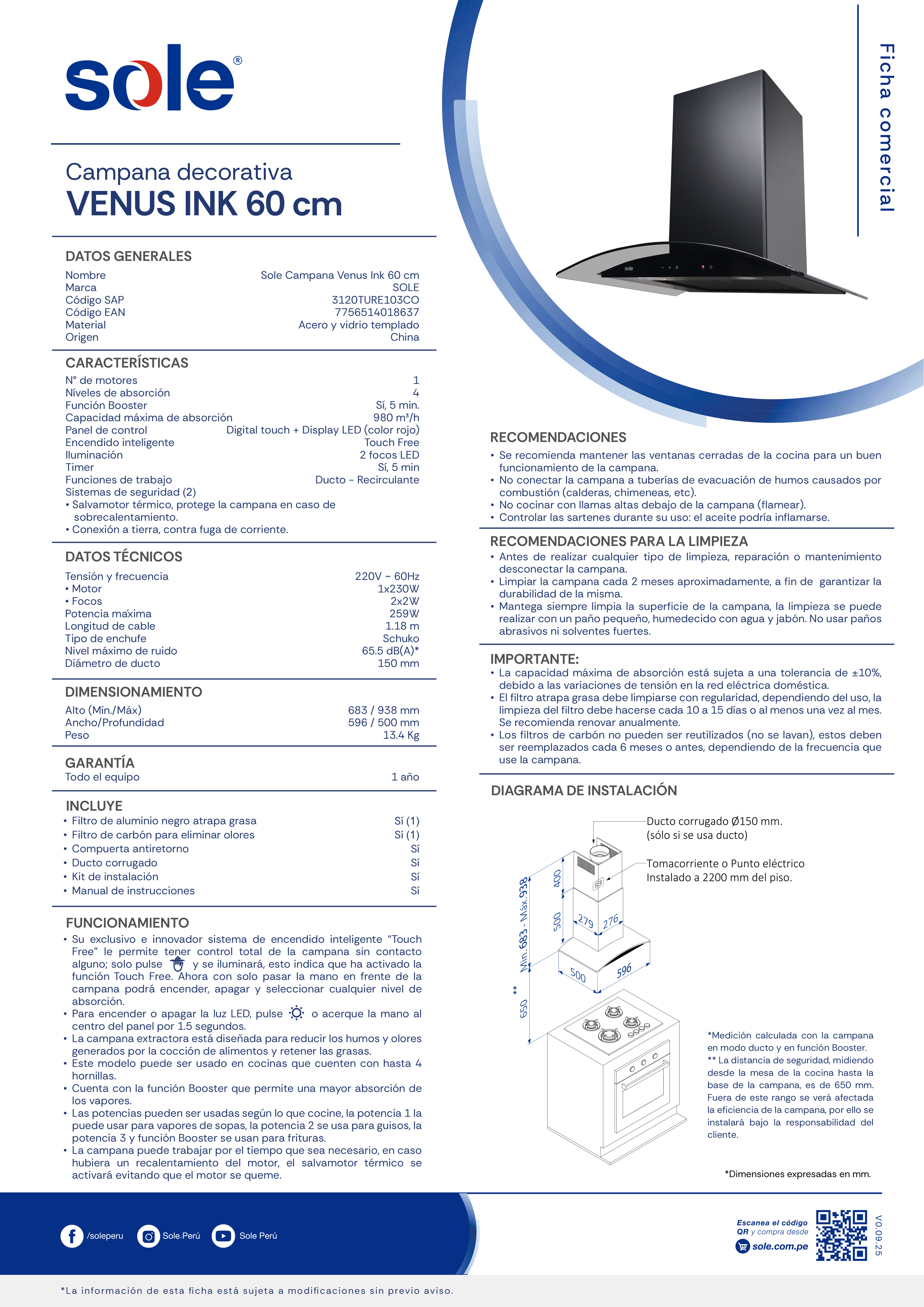 Dale un toque moderno y sofisticado a tu cocina con la nueva Campana decorativa Venus Ink, diseñada para combinar estilo, innovación y alto rendimiento. Con una potente capacidad de extracción de 980 m³/h, elimina eficazmente humo, grasa y olores, manteniendo el ambiente siempre fresco. Su encendido inteligente te permite controlarla sin tocarla, brindándote comodidad y tecnología en un solo movimiento. Además, su iluminación LED y timer de apagado automático hacen que cocinar sea más práctico y eficiente.
