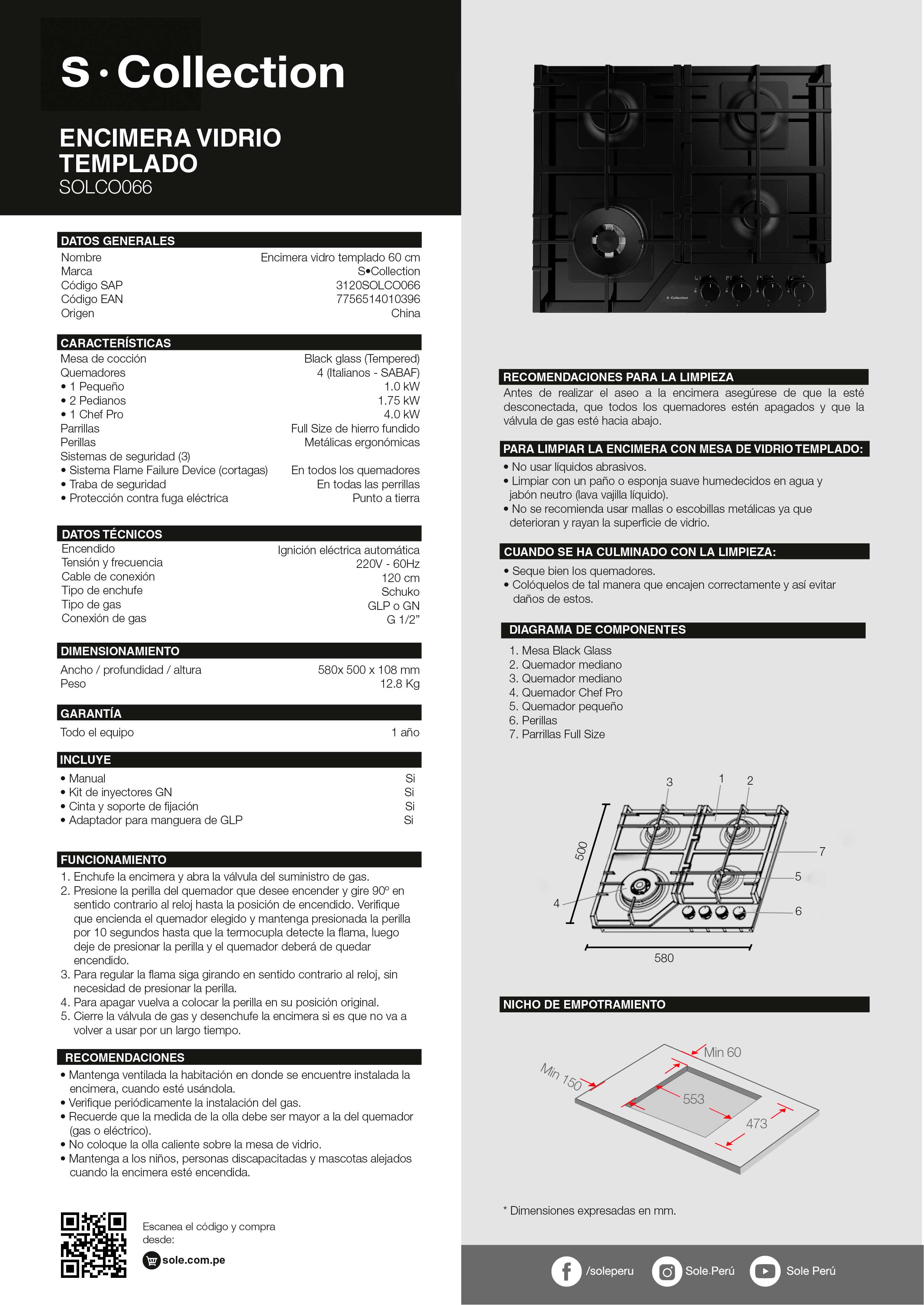 Resalta la elegancia de tu cocina con la encimera Sole S-COLLECTION de vidrio templado de fácil limpieza y disfruta cocinando con sus múltiples beneficios como Quemador Chef Pro 4.0 ten listo tus alimentos en menos tiempo con la máxima potencia, Parrillas de Hierro Fundido Full Size ultra resistentes y seguras.