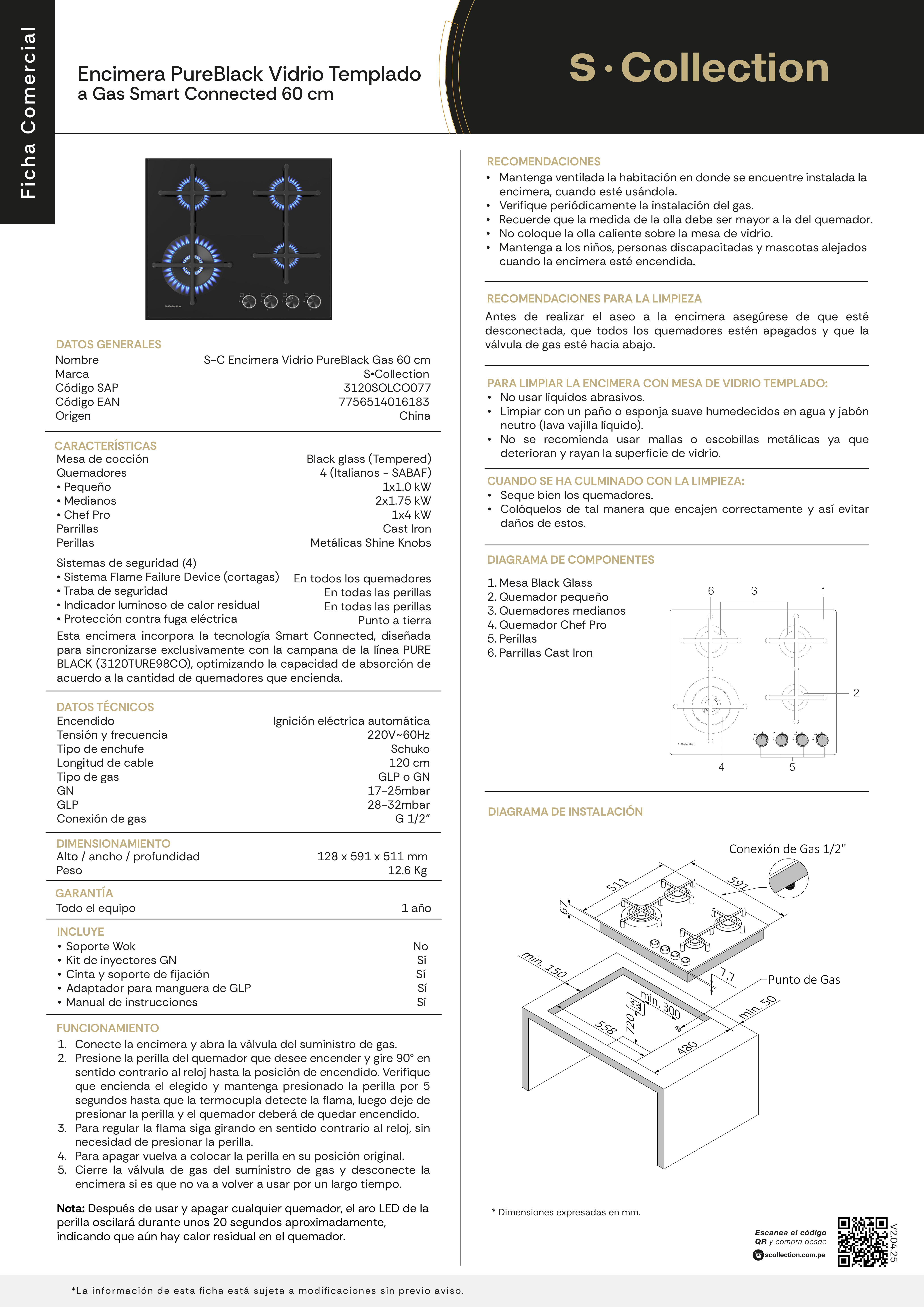 | Tamaño de quemadores | 1 pequeño (1.0 kW.), 2 medianos (1.75 kW), 1 Chef Pro(4 kW) |