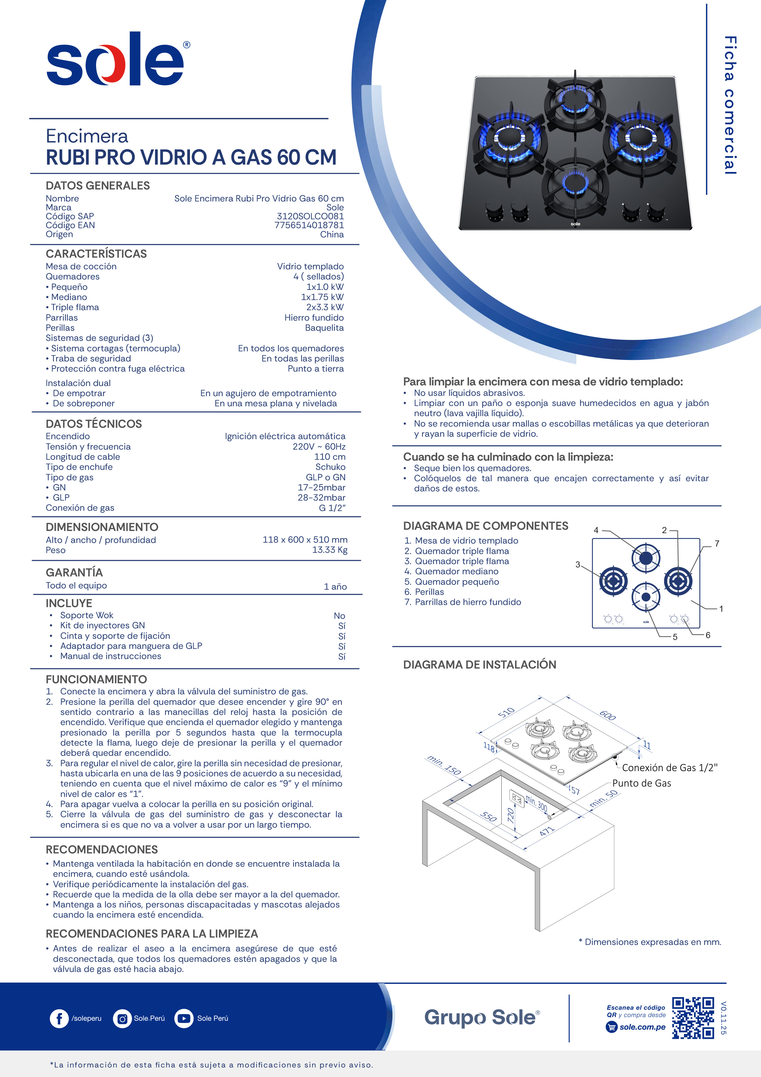 La nueva encimera Rubí es la combinación perfecta de capacidad y estilo. Su diseño patentado e innovador realzará el look de tu cocina para disfrutes de un espacio moderno y perfectamente organizado. Asimismo, te brinda 25% más espacio en el que podrás cocinar con mayor comodidad y eficiencia. La encimera te permite colocar hasta 4 ollas a la vez, para que así ahorres más tiempo haciendo tus recetas. Su mesada de vidrio templado, además de su elegancia, facilita su limpieza. ¡Transforma tu cocina siempre con Sole!