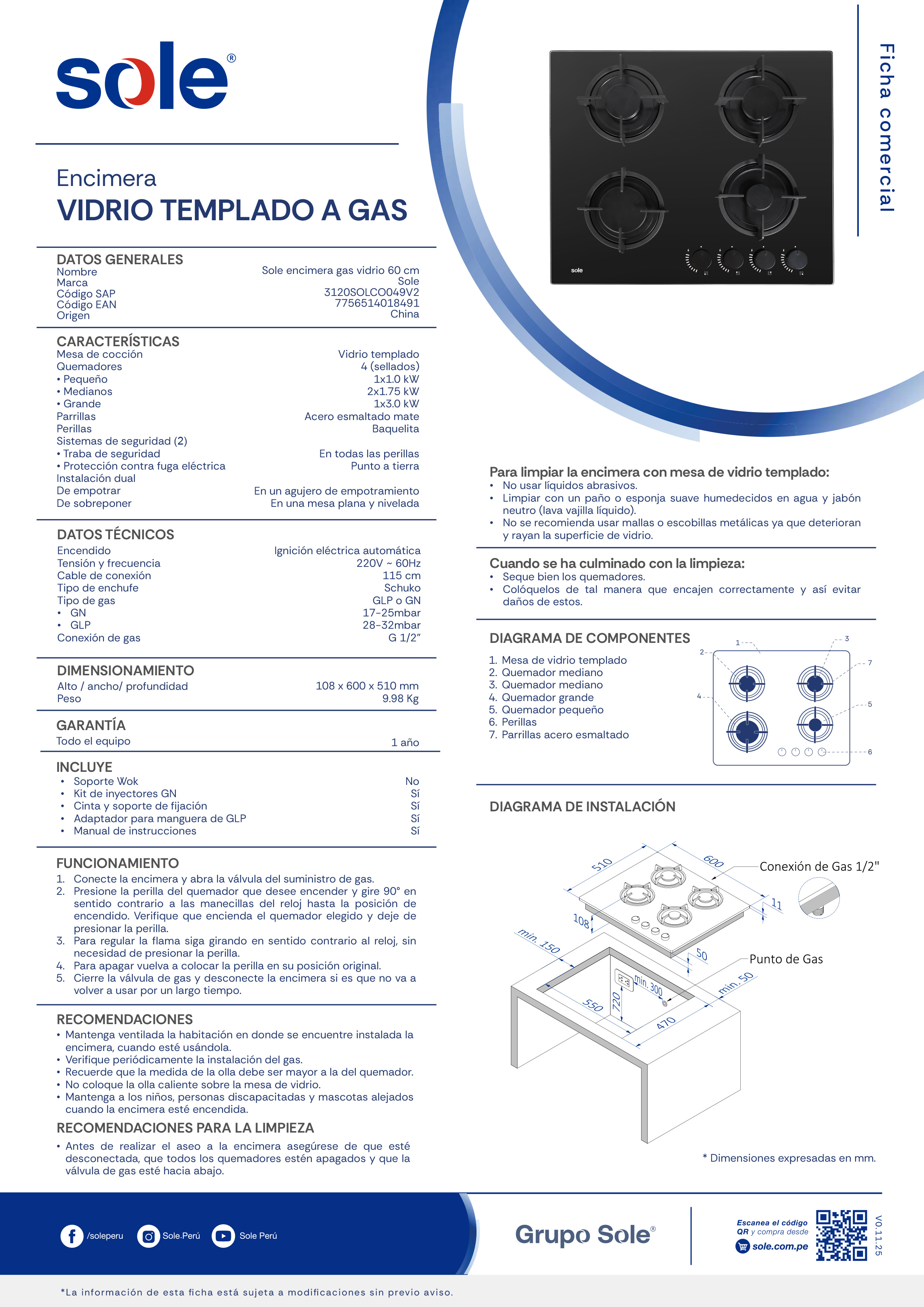 Resalta la elegancia y modernidad de tu cocina con la nueva encimera de Sole. Diseñada para destacar en cada detalle. Su diseño único combina estilo y funcionalidad, mientras que sus parrillas de acero esmaltado mate aportan un acabado sofisticado y con resistencia. Gracias a su superficie de vidrio templado, la limpieza es rápida y sencilla, manteniendo siempre un brillo impecable. Disfruta de cocinar con la calidad y diseño de Sole.