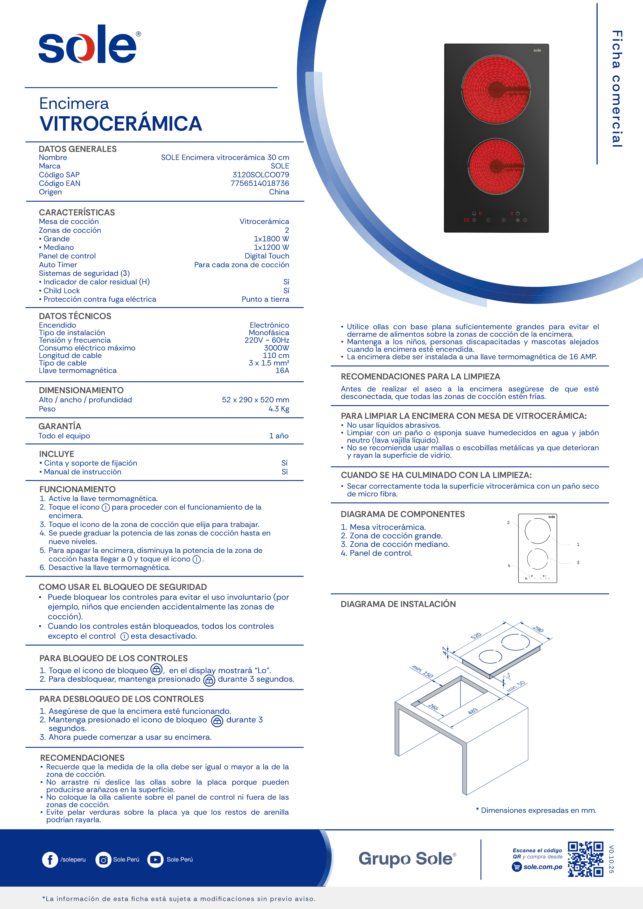 La nueva Encimera Vitrocerámica Sole de 30 cm combina potencia, precisión y diseño moderno en un formato práctico y elegante. Cuenta con dos zonas de cocción, una grande y una mediana, que se adaptan a tus recetas. Su panel digital Touch y Auto Timer facilita una cocción más cómoda y segura. ¡Eficiencia y estilo en el tamaño perfecto para tu cocina!